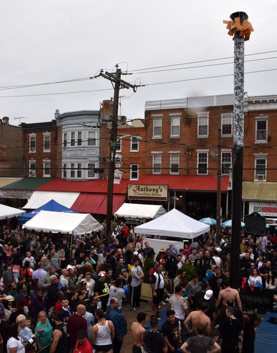 This weekend, May 18th through the 19th, one of our favorite Philadelphia traditions returns to South 9th! Between Wharton and Fitzwater the street will be closed to traffic for the 2-day festival. At Noon on both days, revelers can gather in the lot at 9th and Montrose in front of the Rizzo mural with 50,000 of their neighbors to try their luck at climbing the 30-foot greased pole with a team of other confident strong people.