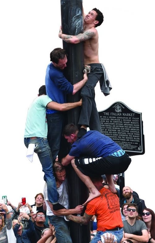 The limoncello is flowing and the cannolis are stacked and the crowd is going nuts for the few that are crazy enough to try their way up the pole to claim the prizes of meats, cheeses, money, and gift cards.